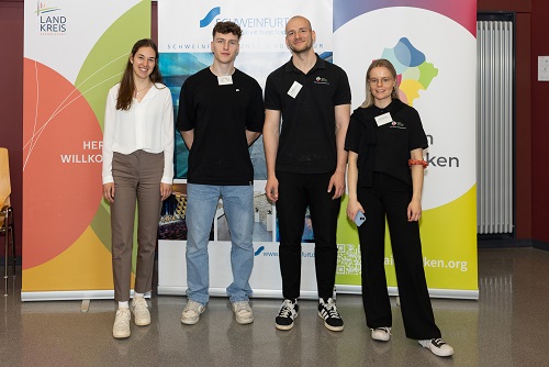 Veranstalter des Company Slams (v.l.n.r.).: Rebecca Weber (Landkreis Schweinfurt), Noah Mack (Stadt Schweinfurt), Maximilian Heil (Region Mainfranken GmbH), Paula Steininger (Region Mainfranken GmbH)