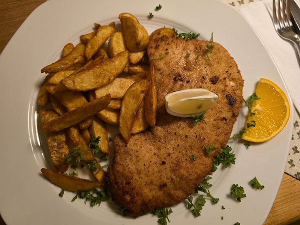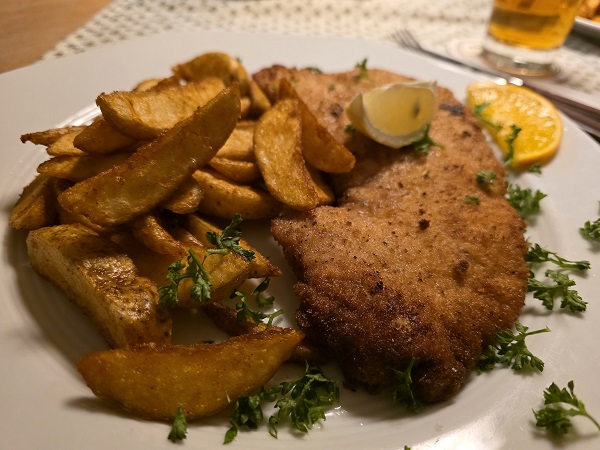 Damals nahmen sich die beiden Schonunger vor: Beim nächsten Mal sollte es ein Fleischgericht sein. Und es wurde: In beiden Fällen ein paniertes Putenschnitzel mit Western-Kartoffeln. Michael zögerte allerdings lange und ließ sich bis zum zweiten Bockbier Zeit mit seiner Entscheidung, weil ihn auch das Jäger- und das Paprikaschnitzel mit Pommes Frites reizten oder das normale Schitzel Wiener Art sogar mit Bratkartoffeln für einen kleinen Aufpreis.