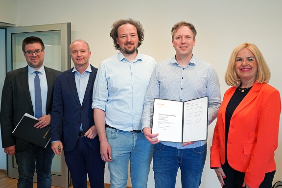 Gemeinsam mit Landrätin Tamara Bischof unterzeichnete Stiftungsprofessor und TTZ-Leiter Prof. Dr. Erik Schaffernicht die Fördervereinbarung mit den beiden DriveCon-Geschäftsführern Andreas und Michael Weisenseel sowie Vizepräsident Prof. Dr. Jan Schmitt für die Technische Hochschule Würzburg-Schweinfurt (THWS).