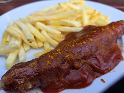 Auf den Teller kamen: Für Michael eine Currywurst mit ganz viel Soße und Pommes Frittes, eine ideale Speise am Abend im Biergarten bei noch knapp 20 Grad.