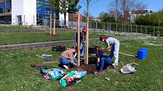 Voller Einsatz: An der Realschule Dettelbach wird ein neuer Baum gepflanzt