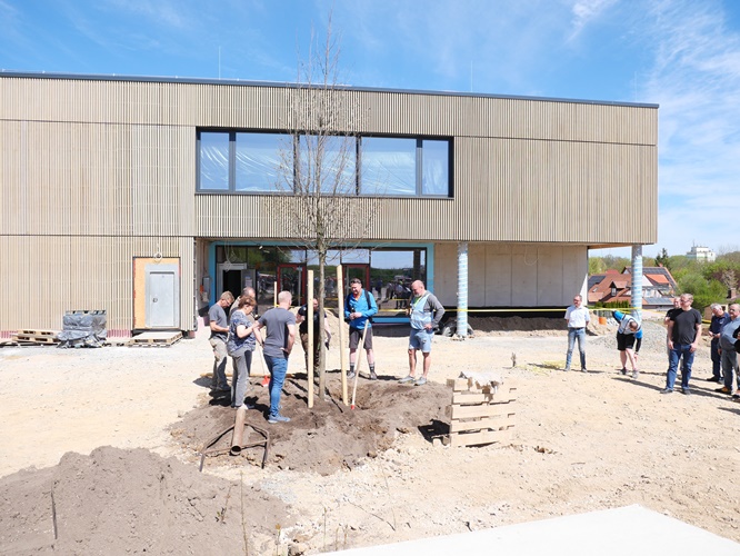 Ein weiterer Höhepunkt der Tour lag in Gaukönigshofen und führte mitten hinein in die Zukunft des Landkreises. Während der Sportverein die Radgruppe mit einer warmen Mahlzeit versorgte, konnten die Teilnehmerinnen und Teilnehmer einen Blick auf den Fortschritt am Neubau der Drei-Linden-Schule werfen. Wo derzeit noch gebaut wird, sollen bereits ab September 2026 rund 80 Schülerinnen und Schüler lernen. Ein besonderer Moment entstand dort im Zeichen des „Tags des Baumes“: Gemeinsam pflanzten Landrat Thomas Eberth, Fachberaterin Jessica Tokarek sowie Vertreterinnen und Vertreter der Schulfamilie und des Kreisverbands Gartenbau und Landschaftspflege eine klimaresistente Silberlinde – als lebendiges Symbol für Wachstum und Beständigkeit.
