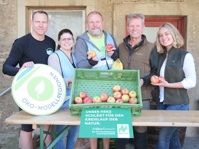 4: Mit bio-regionalen Äpfeln vom Obstgut Wäldleinhof setzte die Öko-Modellregion stadt.land.wü. auch beim Radlerfrühling 2026 ein Zeichen für regionale Wertschöpfung und der Fairtrade-Landkreis Würzburg mit fair gehandelten Bananen für globale Verantwortung. Von links: Rico Neubert und Rebecca-Michelle Walther vom Landratsamt Würzburg, Landrat Thomas Eberth und Obstbauer Jürgen Fecher mit Begleitung.