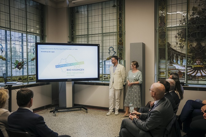 Die Wirtschaftsförderer von Bad Kissingen, Sebastian M. Bünner, und Bad Neustadt an der Saale, Constanze Katzenberger, präsentierten beim Netzwerktreffen das neue Logo des Doppeloberzentrums Bad Kissingen/Bad Neustadt a. d. Saale.